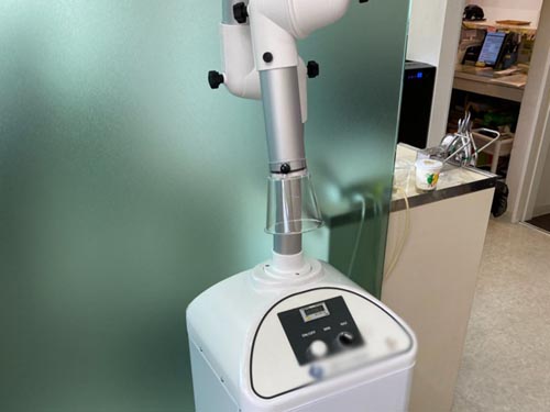 通常のバキューム(唾液や粉塵の吸い取り)に加え、エアロゾル発生を予防するための口腔外バキュームを導入しています。