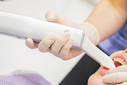 マウスピース型装置を作製するにあたり、3D口腔内スキャナを使用し歯の型採りをします。数分お口を開いていただき、小さな装置でなぞるだけで歯型を採ることができます。