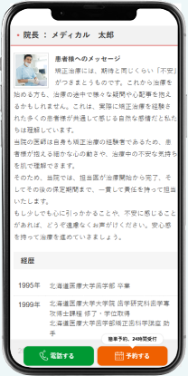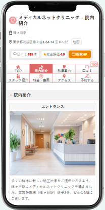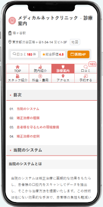 PC・スマートフォンの各種デバイスに掲載が出来ます。掲載内容は診療メニュー、 費用、アクセスや院内写真などで、お困りの患者様に効果的にアプローチ可能です。